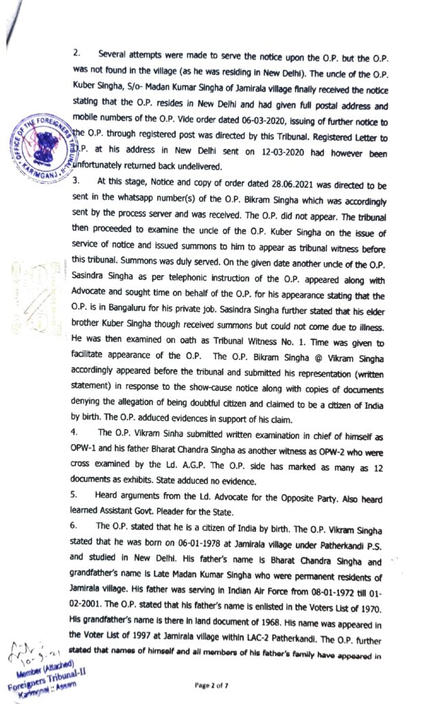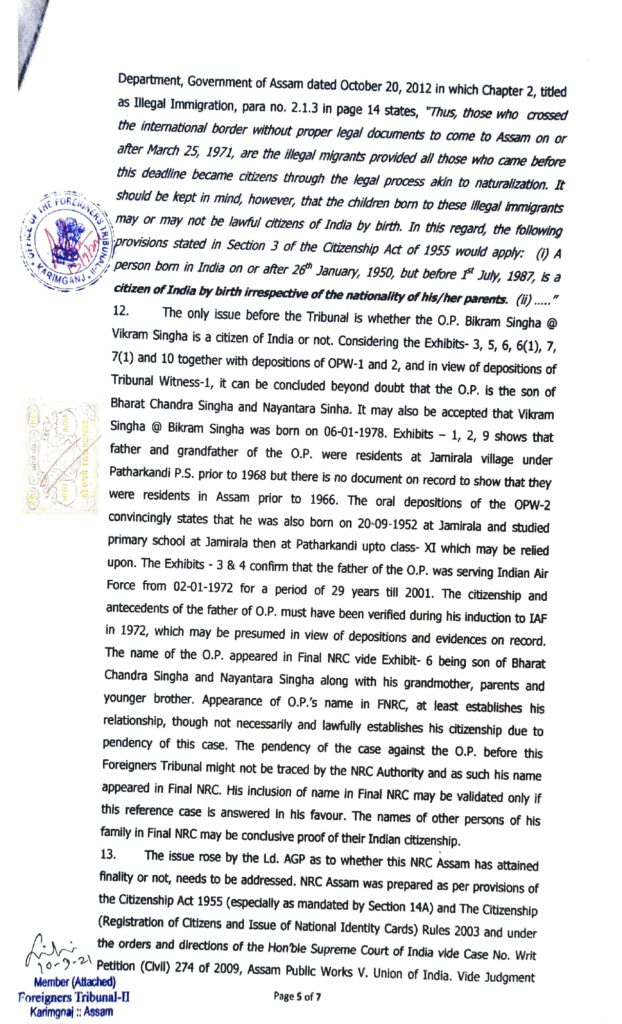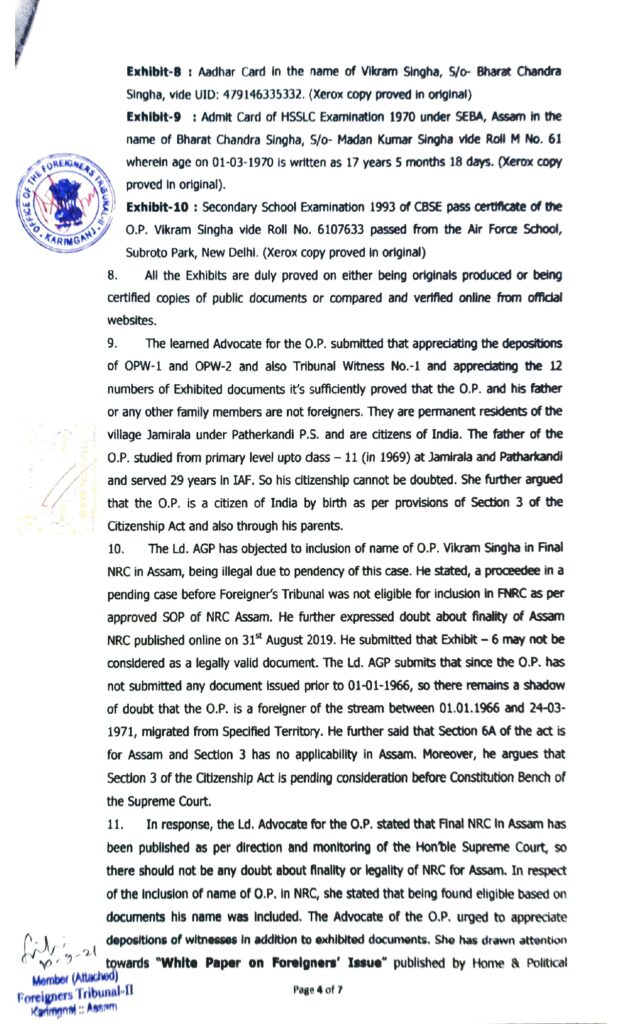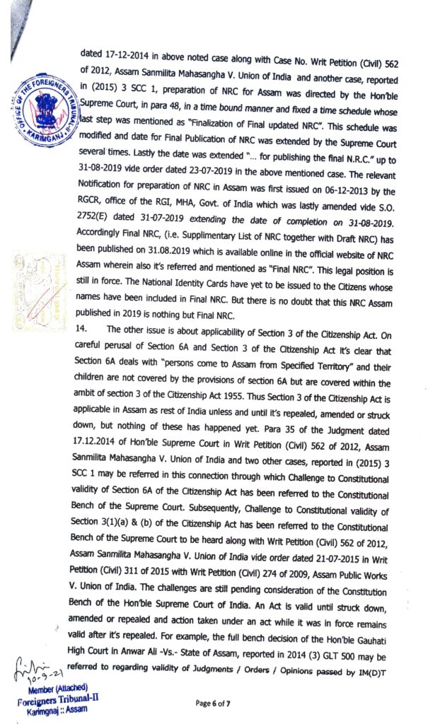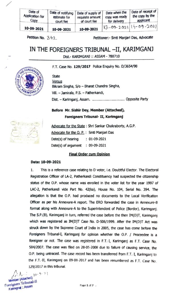 বিগত দিনগুলোতে এনারসি/ডি-ভোটার নিয়ে অনেক সিদ্ধান্তই একতরফা হচ্ছে বলে বিভিন্ন মহলে অভিযোগ রয়েছে। এই পরিস্থিতিতে এফটি বা ফরেনার্স ট্রাইব্যুনালের একটি সাম্প্রতিক রায়/অভিমত বিষয়গুলোকে পুনর্বিবেচনায় নিয়ে আসল। করিমগঞ্জের দু-নম্বর ফরেনার্স ট্রাইব্যুনালের ১২৯/২০১৭ নম্বর এফটি মামলায় গত ১০ সেপ্টেম্বর ২০২১ তারিখের রায় অনেককেই জাগিয়ে তুলতে সহায়কের ভূমিকা পালন করবে বলে সংশ্লিষ্ট মহলের অভিমত। যেমন, সমাজকর্মী আশিস চৌধুরীর ভাষায় “নিজের গন্ডির মধ্যে থেকে এই-ধরণের ‘ভালো লাগা’ কাজ করার অভ্যাস যদি আমরা সকলে আয়ত্ত করে নিতে পারি তবে মাথে উঁচু করে টিকে থাকার সাহস আমাদের বাড়বে, আর তখনই আত্মসম্মান অক্ষুণ্ণ রেখে টিকে থাকার জন্য যুদ্ধ চালিয়ে যেতে পারব।”