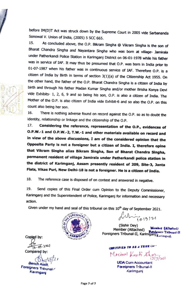 আসামের মাননীয় মুখ্যমন্ত্রী যে করিমগঞ্জের ফরেনার্স ট্রাইব্যুনালের রায়কে গুরুত্বহীন বলেছেন – এর পেছনে অবশ্যই এ-ধরনের প্রক্রিয়া শুরু করার ইঙ্গিত রয়েছে বলে অনুমান করাই যায়। এখানেই অনেকে বিক্রমবাবু এবং তাঁর মতো অনেক ডি-ভোটারদের ভবিষ্যৎ সম্পর্কে সিঁদুরে মেঘ দেখছেন। তবে সরকার এই রায়কে নাকচ করতে পারবে না, সরকার উচ্চ ন্যায়ালয়ে এর বিরুদ্ধে আবেদন করতে পারে, সিদ্ধান্ত কেবল ন্যায়ালয় নিতে পারবে। আর এখানেই বিক্রমবাবুর প্রাথমিক জয়।